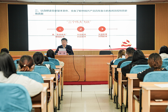 杨勇指出,在一百年波澜壮阔的历史进程中,党团结带领人民开辟了伟大道路,建立了伟大功业。回望走过的奋斗路,眺望前进的奋进路,必须把党的历史学习好、总结好,把党的成功经验传承好、发扬好。学院师生要认真研读党史基本著作,全面了解中国共产党百年奋斗的光辉历程和历史性贡献,深入理解习近平总书记对我们党发展历史“从站起来、富起来到强起来”的“三个伟大飞跃”的重要论述,充分认识100年来党团结带领全国各族人民进行的持续不断的伟大奋斗,创造的一个又一个人间奇迹,真正做到悟透思想,掌握实质,增强“四个意识”、坚定“四个自信”、做到“两个维护”。