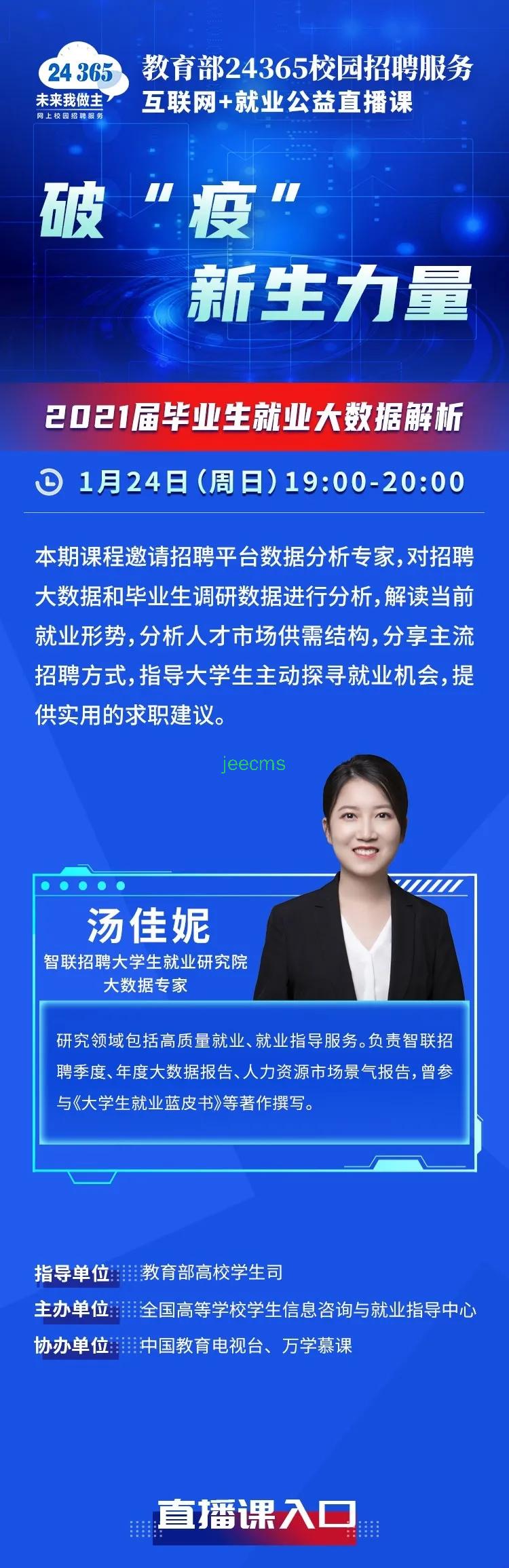 教育部互联网+就业公益课程(第41期)1月24日(周日)19:00-20:00播出,智联招聘就业大数据专家汤佳妮老师,将对相关数据和招聘形势进行分析,指导毕业生主动把握职业机会,提供实用的求职建议。课程结束后举办专场答疑活动,欢迎老师们、同学们转发收看!